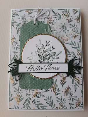 I stamped a spray of leaves with two of the Eden's Garden stamp in Soft Succulent and Evening Evergreen inks and cut the circle using the Layered circles dies for the image and scalloped gold foil . This has been mounted on dimensionals.